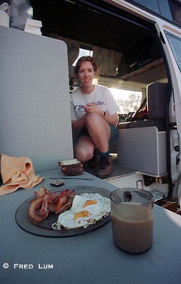 Check out this 'wholesome' breakfast of eggs (sunnyside up ),thick slabs of Aussie bacon and a cuppaEarl grey ! Mmm mmm good !