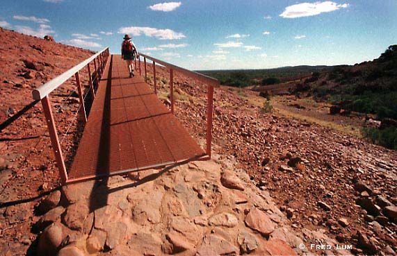 Katrina crosses over one of the few manmade structures at Kata Tjuta.