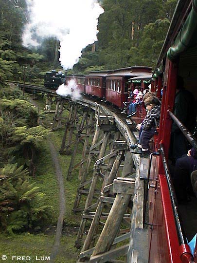 Every time we've been to Australia we've ridden Puffing Billy.It must bethe ashes flying in your eyes or the steam whistle or maybe it'sgetting to hang your feet over the side like you're a kid again.