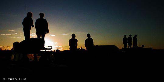 Uluru sunset viewers are silhouetted by the clear sky as the sun begins to drop to the horizon.