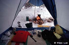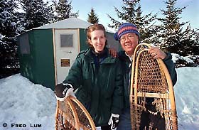 Since the Park established electrical sites at Mew,this has opened up a whole new world for people who don't want to tent in the cold.Ever since we got our VW Westfalia camper,we just hook her up and fire up the small electric heater ! Yeah it's kinda cush but it's not exactly shirtsleeves and shorts.Staying up late reading is also much more enjoyable.When we head out from the campground for a ski or hike,we leave the heater running and by the time we return,everything has dried out and it's warm and welcoming in the Westy. For real luxury,the Park also rents out yurts year round.These eight sided habitats can sleep six people (two sets of bunks beds ) and they have...light ! Cooking is not allowed inside the shelters so you'll still have to bring up the Coleman two burner .There are only seven at Mew Lake and theyre booked up pretty quickly on weekends .I cant see staying in them in the summer but for winter stays there are some points to be made in favor of them.Because of a last minute yurt cancellation,Katrina decided to come up for the weekend and we got a taste of winter yurting. Now I know there will be some campers out there scoffing at this yurt thing saying that its wimping out ,but Ive done the winter tent and quinzee thing and Ill tell you theres nothing really fun about that,its simply a comfort thing.Diving into a sleeping bag early in the evening for the rest of the night is not my idea of fun and isnt that what its all about ? Granted , the heater sounds like a jet taking off but its nice to have heat after a long day of skiing and snowshoeing ! Different strokes for different folks !